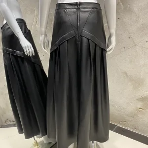 Women’s Black Genuine Leather Maxi Skirt – Geometric Panel Pleated Pocket Detail Office Wear