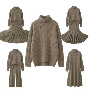 Women’s Cable Knit Turtleneck Sweater and Skirt Set Cashmere Wool Chunky Pullover Winter Warm Knitwear Two Piece Outfit