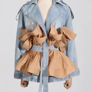 New Style Spliced Belt Design Lapel Ruffle Pleated Lace up Women’s Coat Denim Coats for Women Lapel Patchwork Designer Jacket