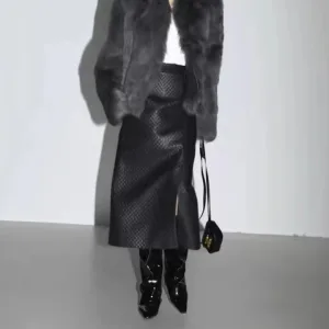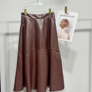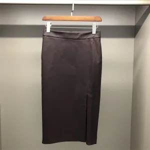 3311Wholesale Leather Skirts High Elastic Adjustable Split Height Knee Length Long Brown Elegant Real Leather Skirt