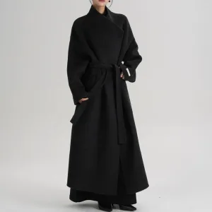 AIMEISI High End Elegant Warm 70% Wool Oblique Collar Long Trench Cashmere Coats for Women Winter Coat