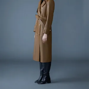 Elegant Brown Double-Breasted Trench Coat with Gold Accents and Belted Waist